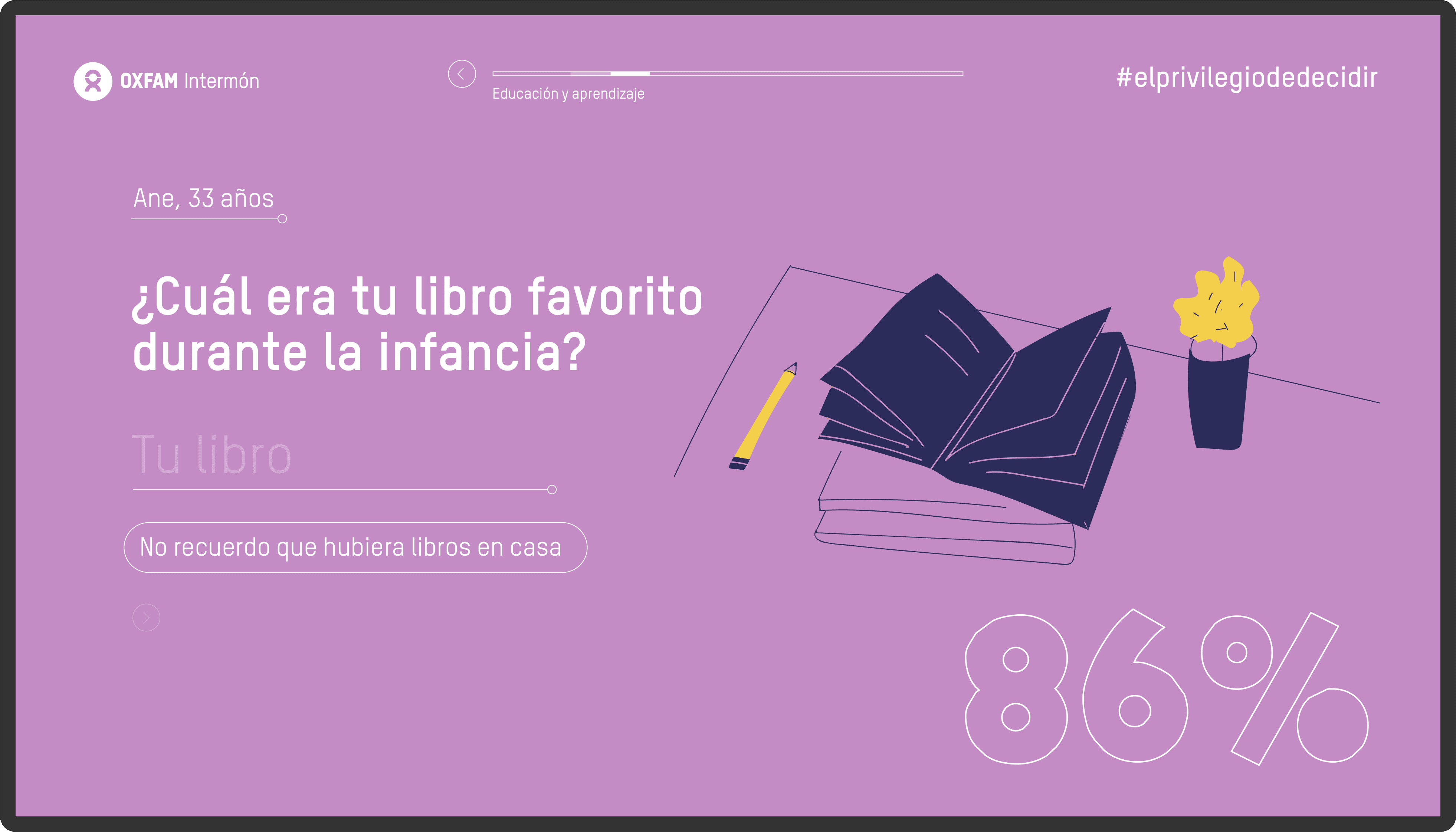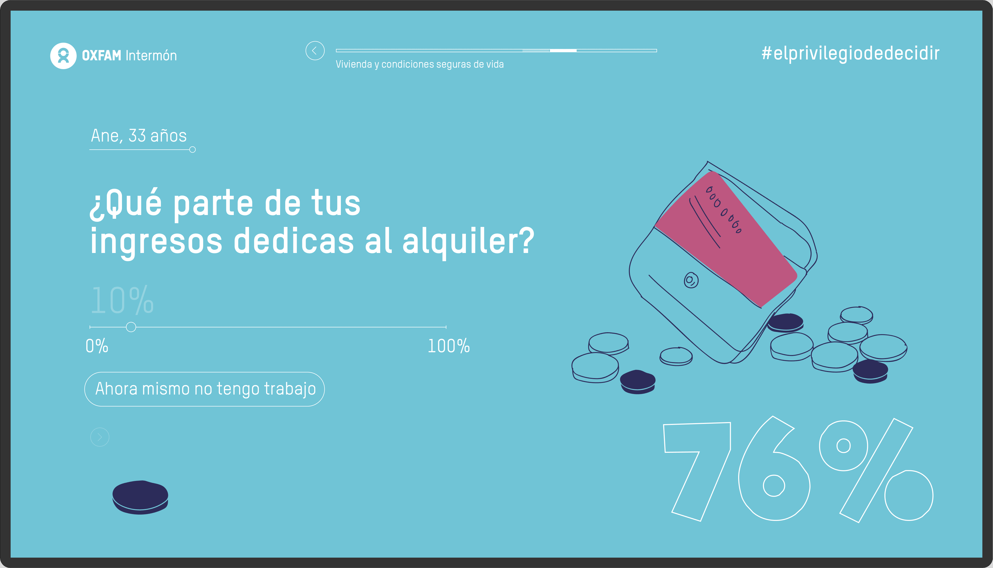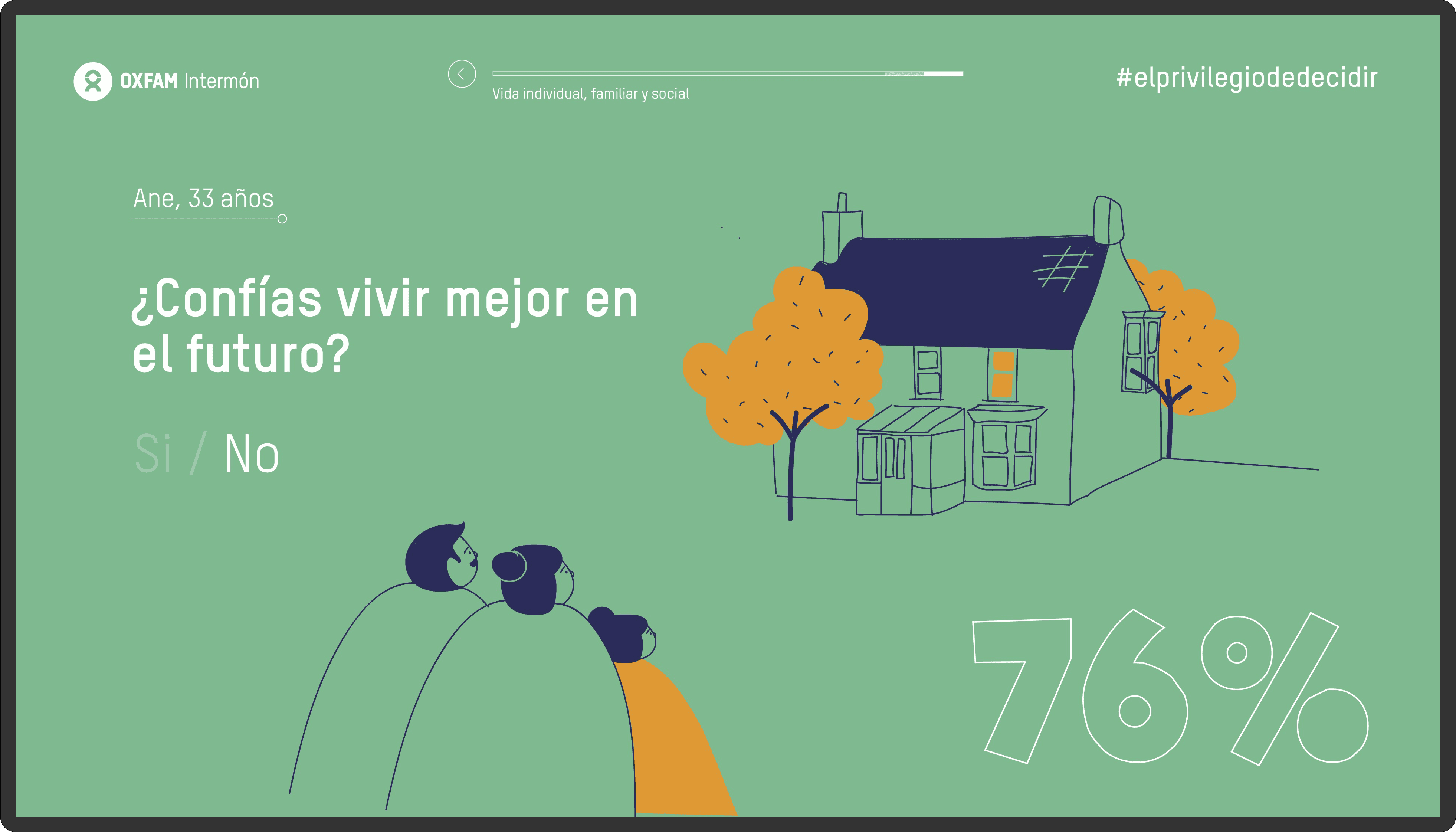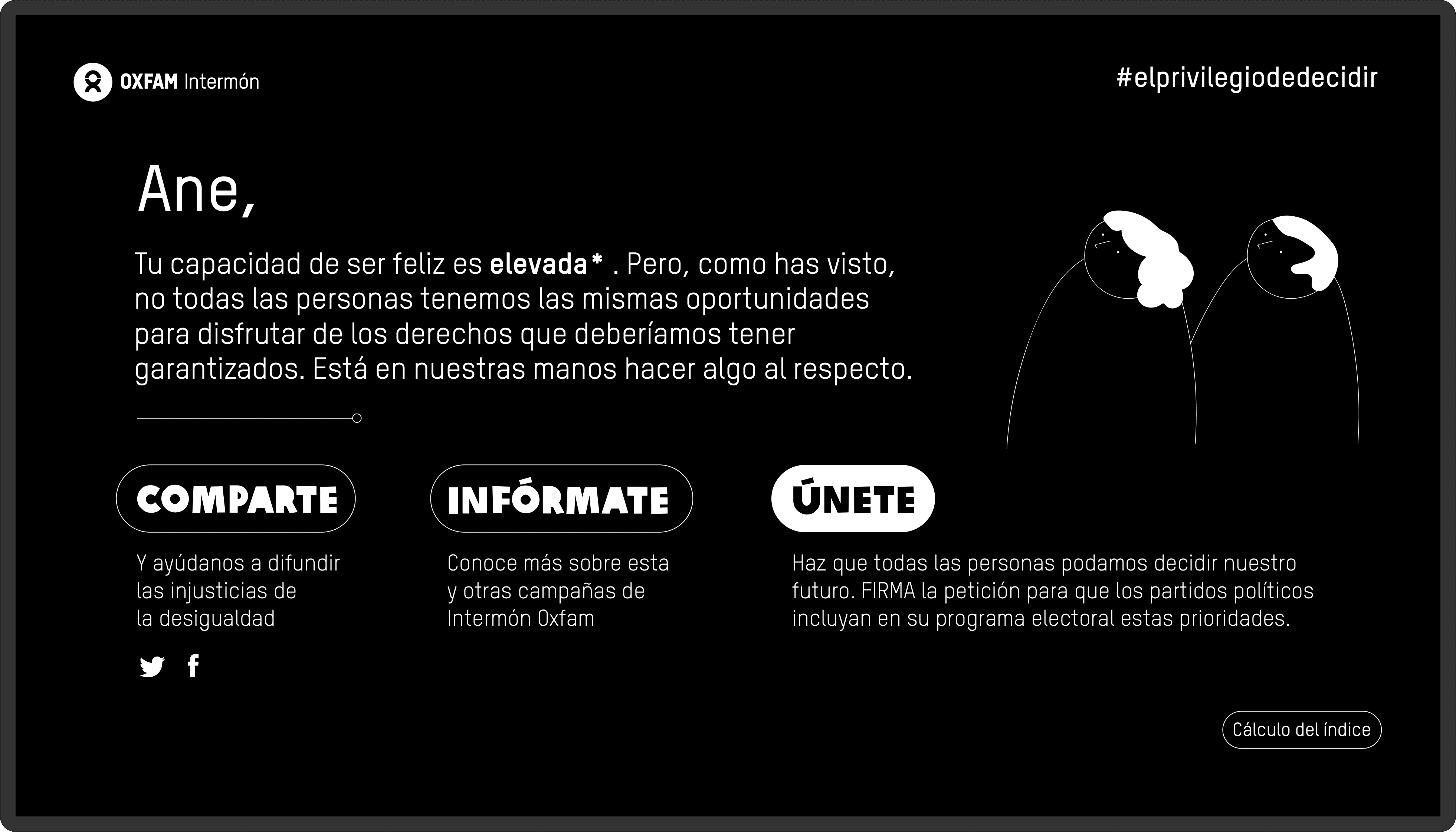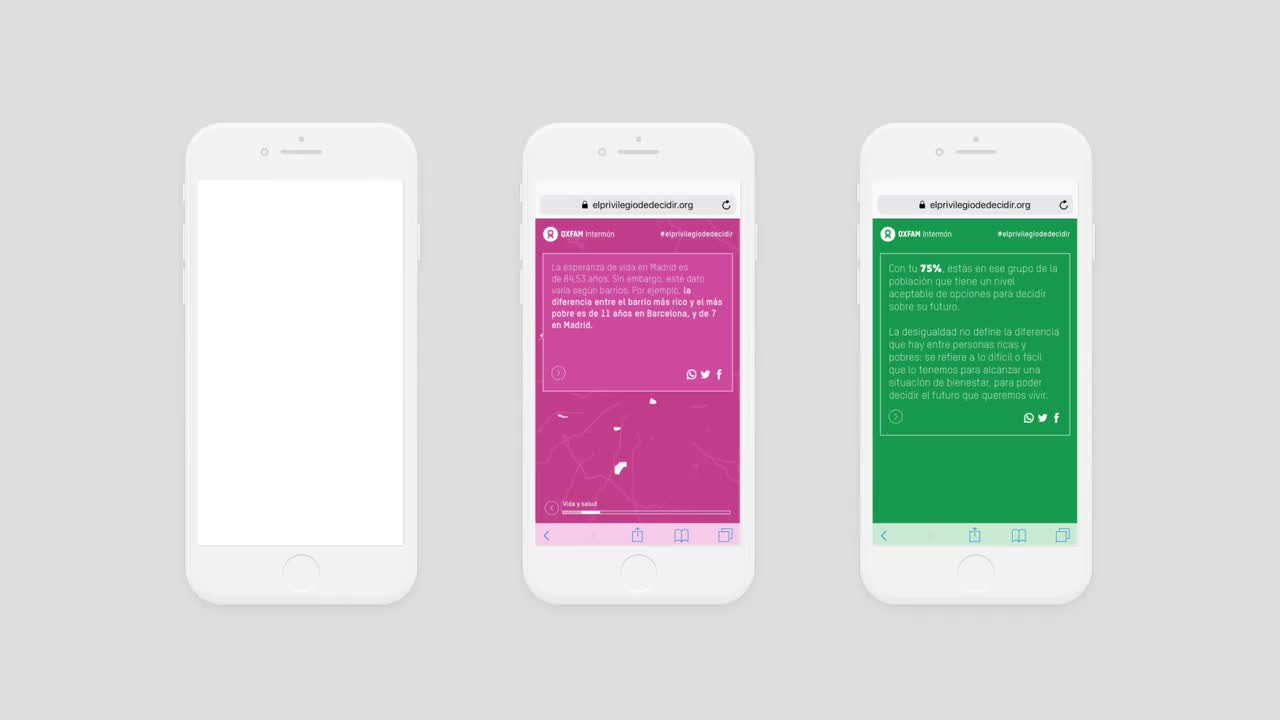 At www.elprivilegiodedecidir.com (currently unavailable), users could calculate in a percentage, that we called “the privilege index”, their level of privilege in society, and they could understand why many different factors can alter how fortunate they might be in life through data. The action asked questions related to the kind of house the users were living at, their hopes for the future or even if they had attended any demonstration in the past year. It was an interactive experience that reached a very high engagement ratio, making the signing in number improve up to 400% compared to other engagement actions.