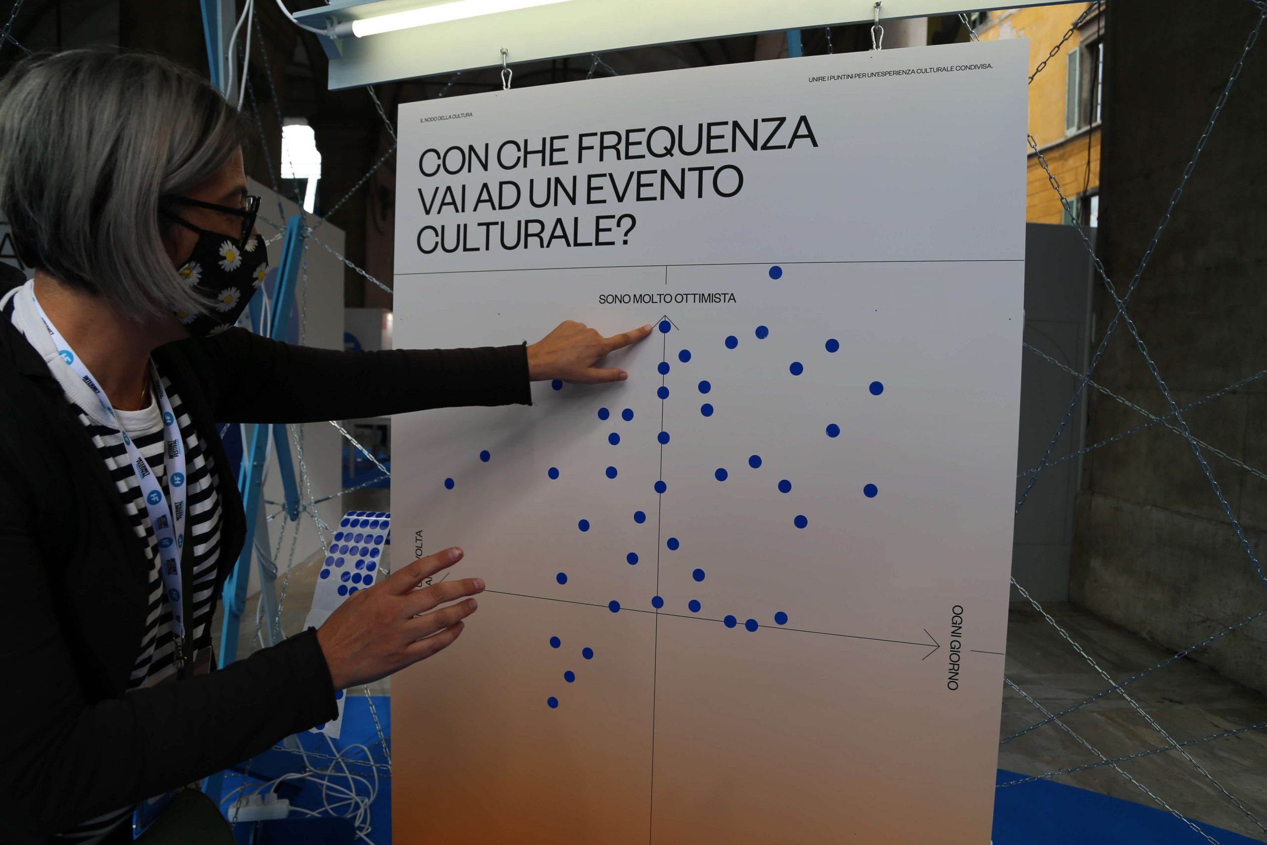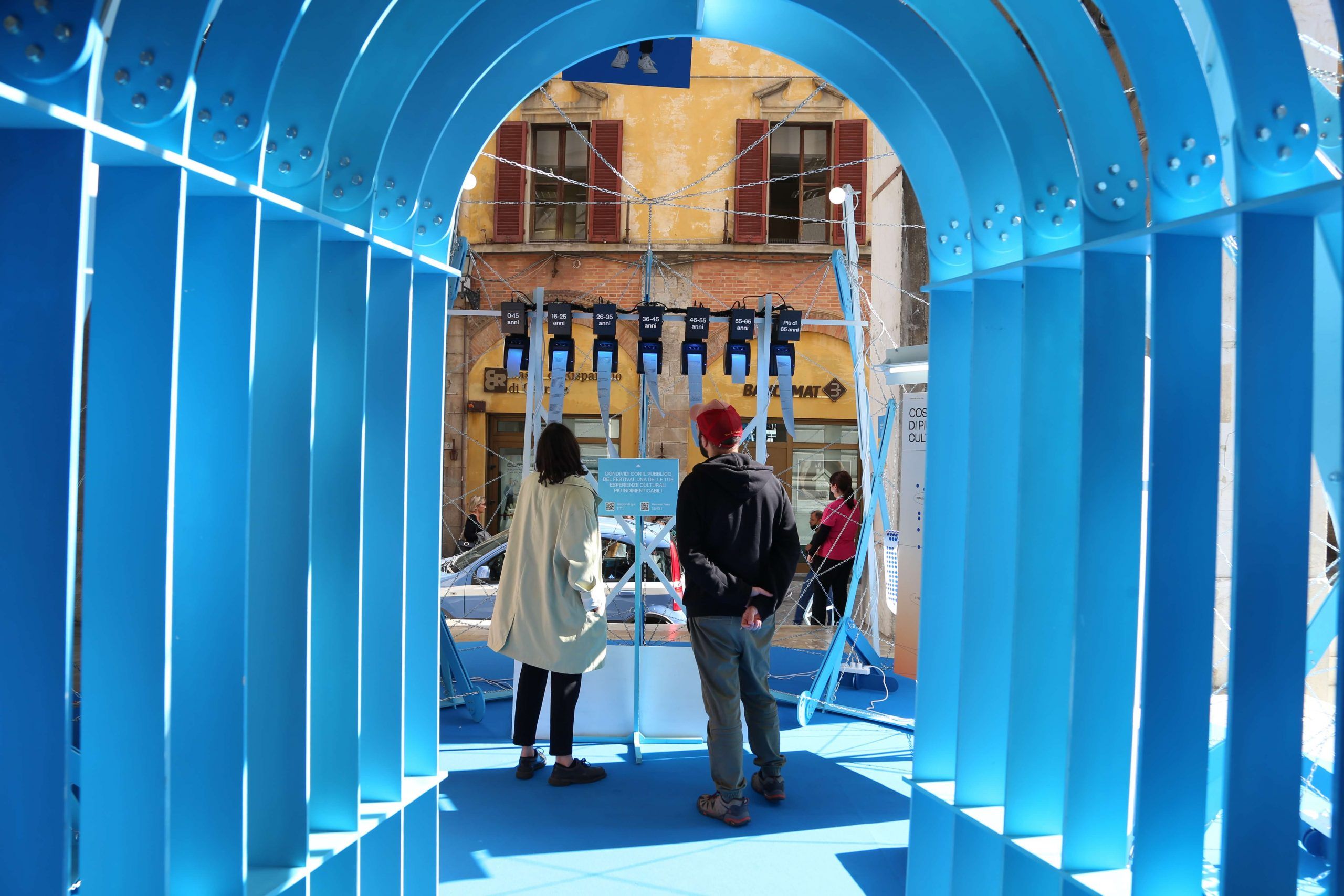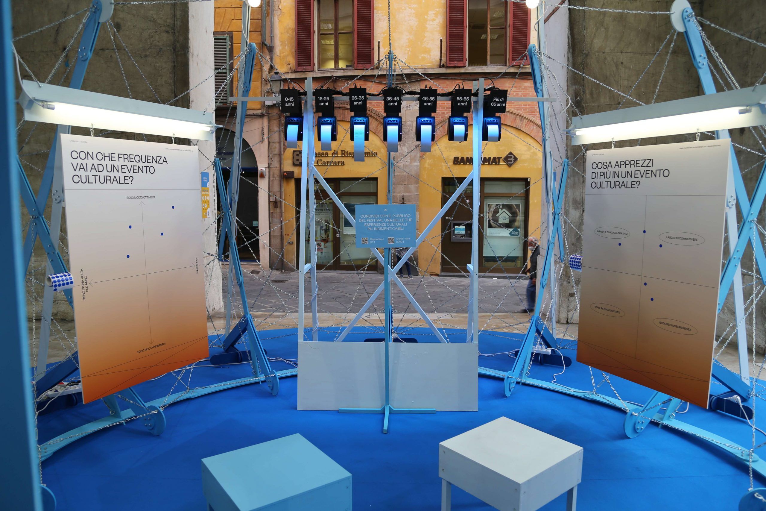 The questions inside the blue pavilion created by TAKK guided the visitors: four of them could be answered in an analog way (using stickers on panels), and the central question could be answered on an online survey. Once the survey had been completed, answers were printed in real-time by thermal printers inside the installation. We asked people questions such as ‘Which of these cultural sins have you committed more often’ or ‘What was the most meaningful cultural experience you’ve had so far?’.