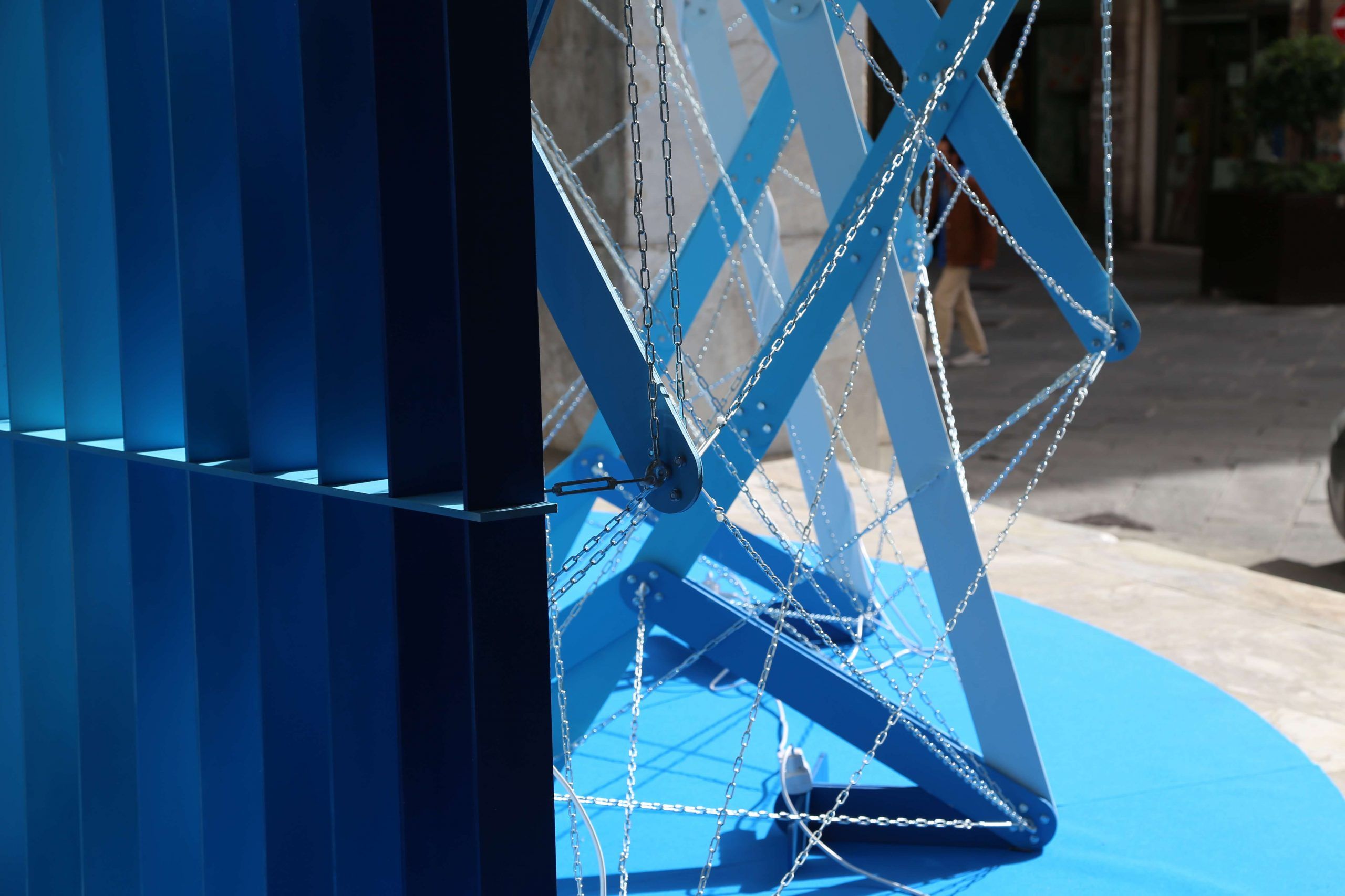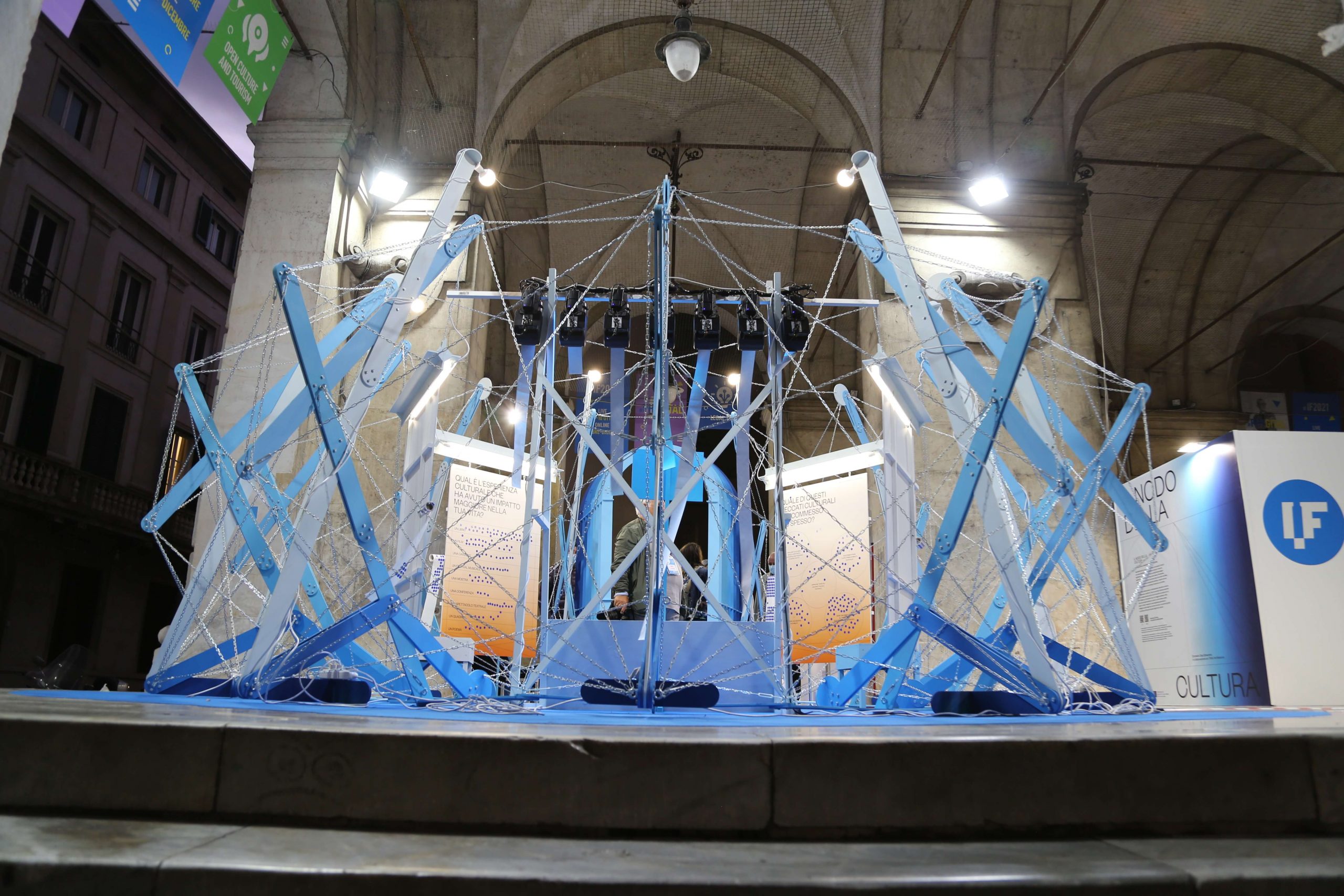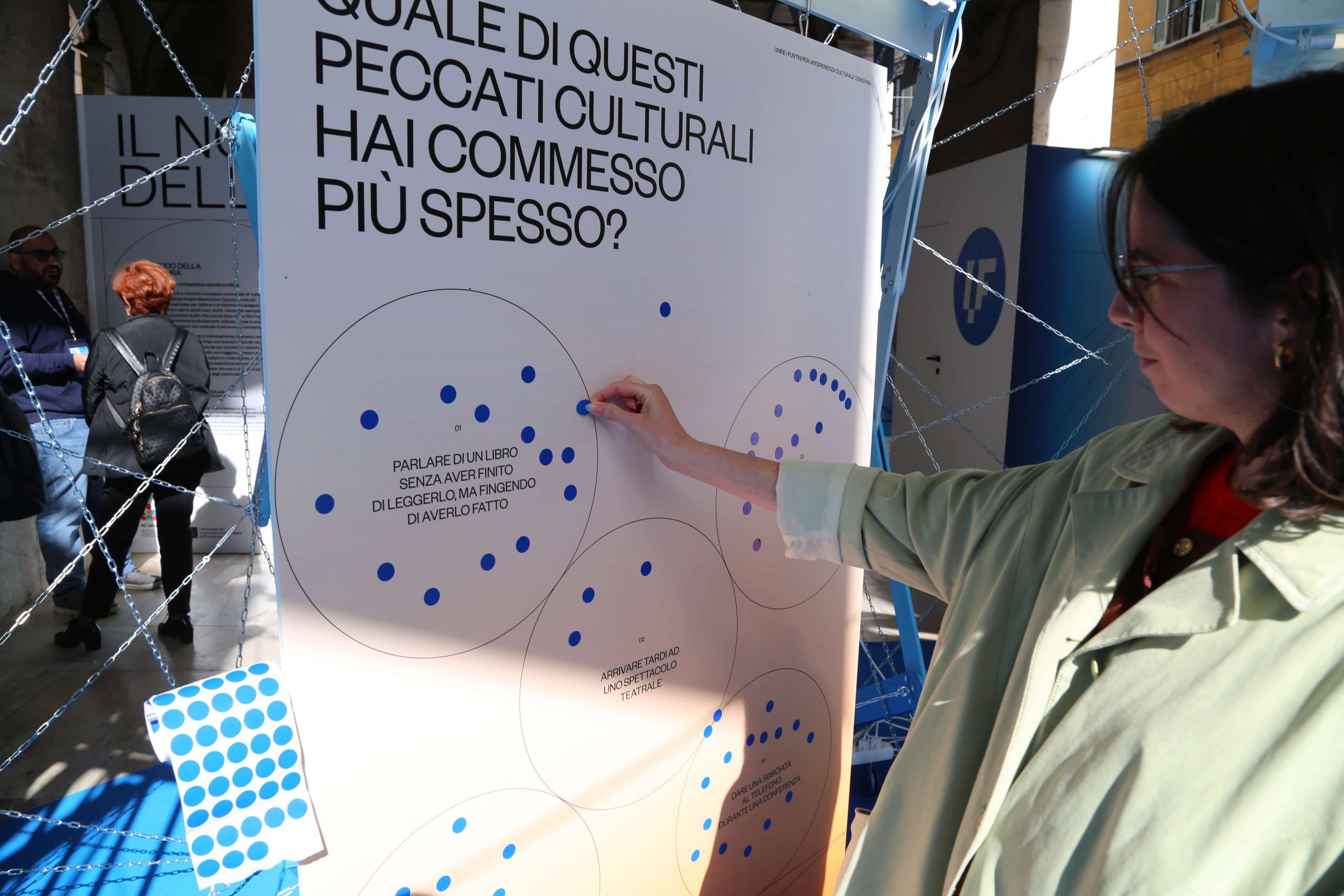 The questions inside the blue pavilion created by TAKK guided the visitors: four of them could be answered in an analog way (using stickers on panels), and the central question could be answered on an online survey. Once the survey had been completed, answers were printed in real-time by thermal printers inside the installation. We asked people questions such as ‘Which of these cultural sins have you committed more often’ or ‘What was the most meaningful cultural experience you’ve had so far?’.