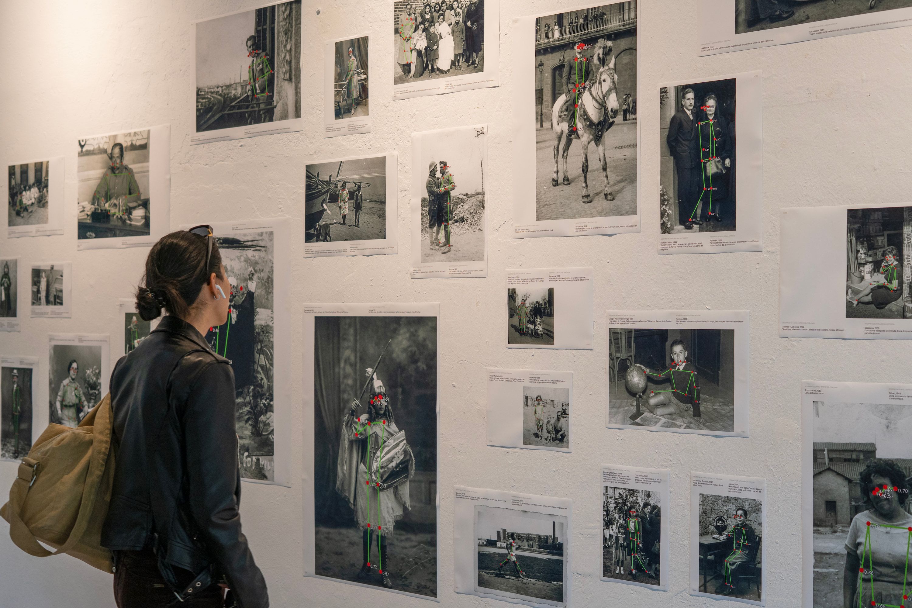 For the main installation, a camera mapped the silhouettes of every visitor, translating joints and angles into a constellation of data points. This digital skeleton is then compared to thousands of gestures extracted from historical photographs of the photographic archive of Poblenou — images of dockworkers, schoolchildren, lovers, and protesters, each frozen in a moment of unguarded, genuine self-expression. The algorithm, trained on this archive, performs a kind of séance: it identifies the participant’s closest kin across time, not by name or face, but by the curve of a spine or the tilt of a head.