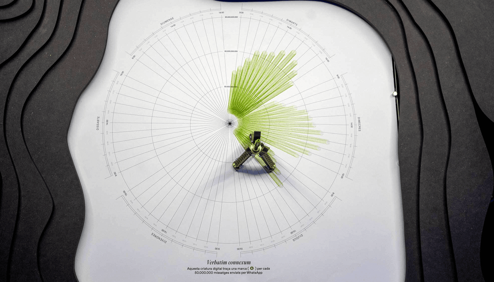 Verbatim Connexum is a versatile critter equipped with antennae, mapping the 4,166,666,666 messages sent over WhatsApp each hour and emphasising the role of language in global connection.