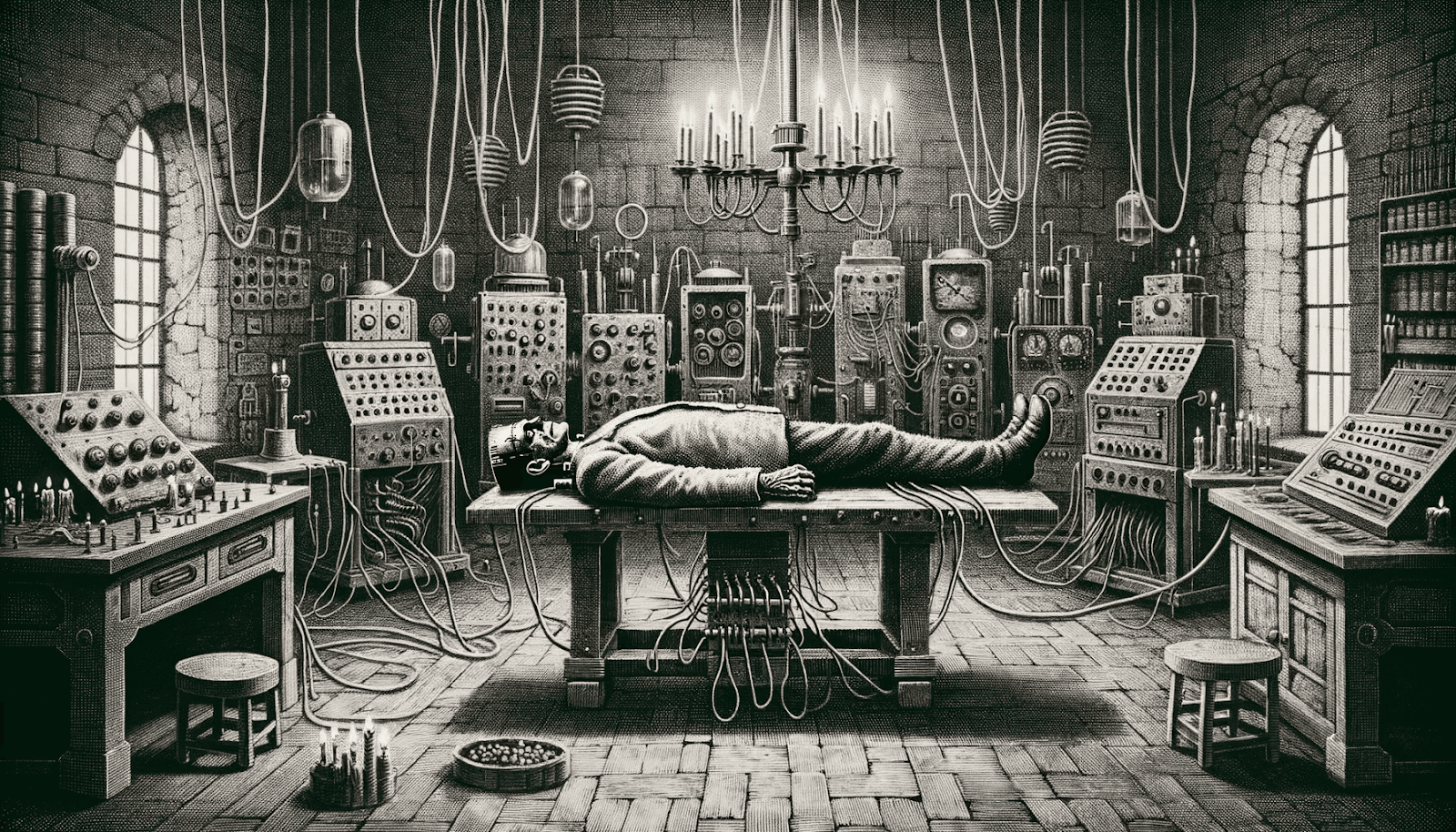 The air was thick with tension and the scent of chemicals. It reminded me of the first time he wound me up, as if infusing me with a measure of life, setting my gears in motion. But what he sought to do now was more daring: animate a confluence of mismatched body parts. When the spark ignited and the creature’s dull yellow eye flickered open, it was as if the room itself gasped. The walls seemed to recoil, the books shuddered on their shelves, and even my pendulum felt as if it hesitated for the briefest of moments.