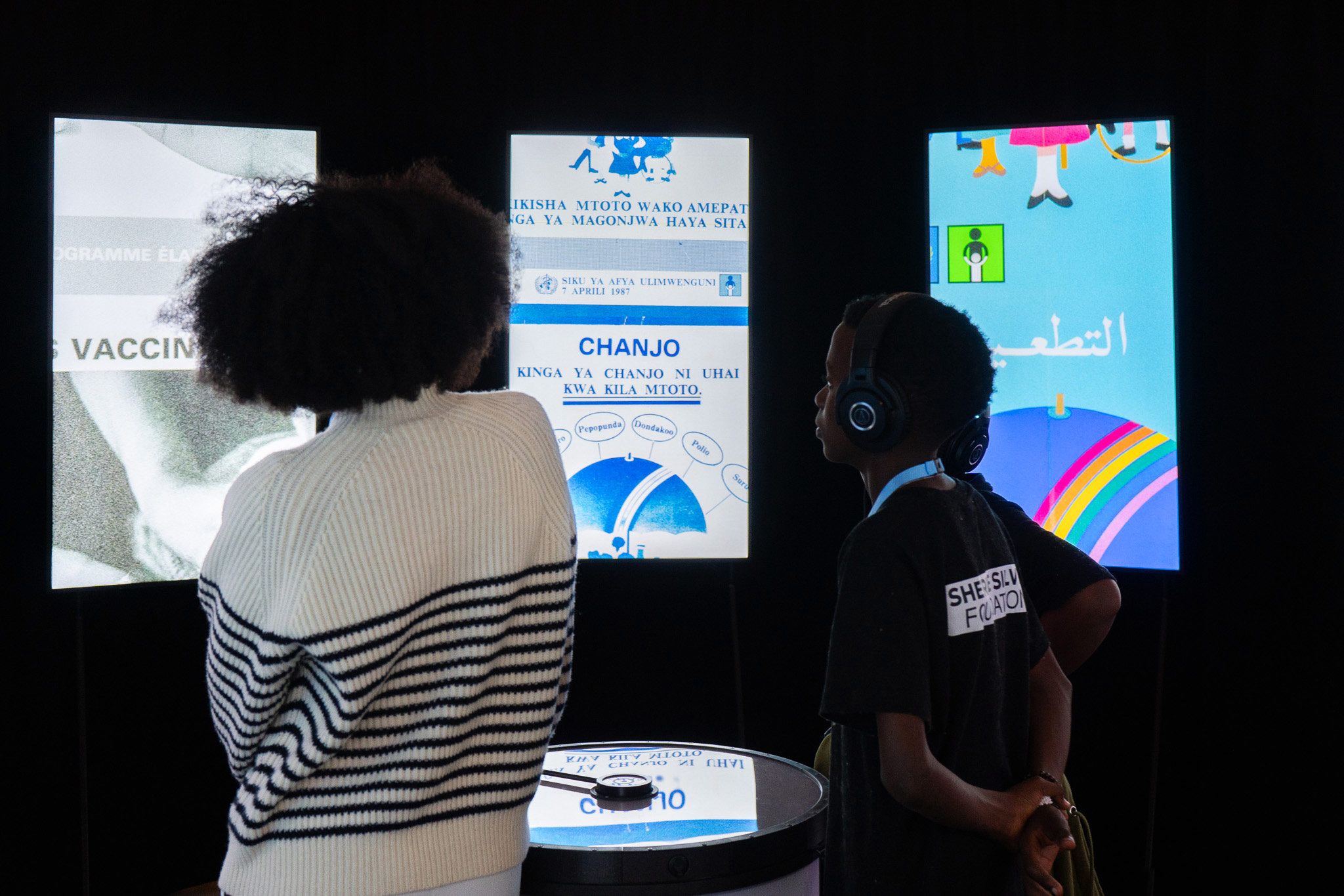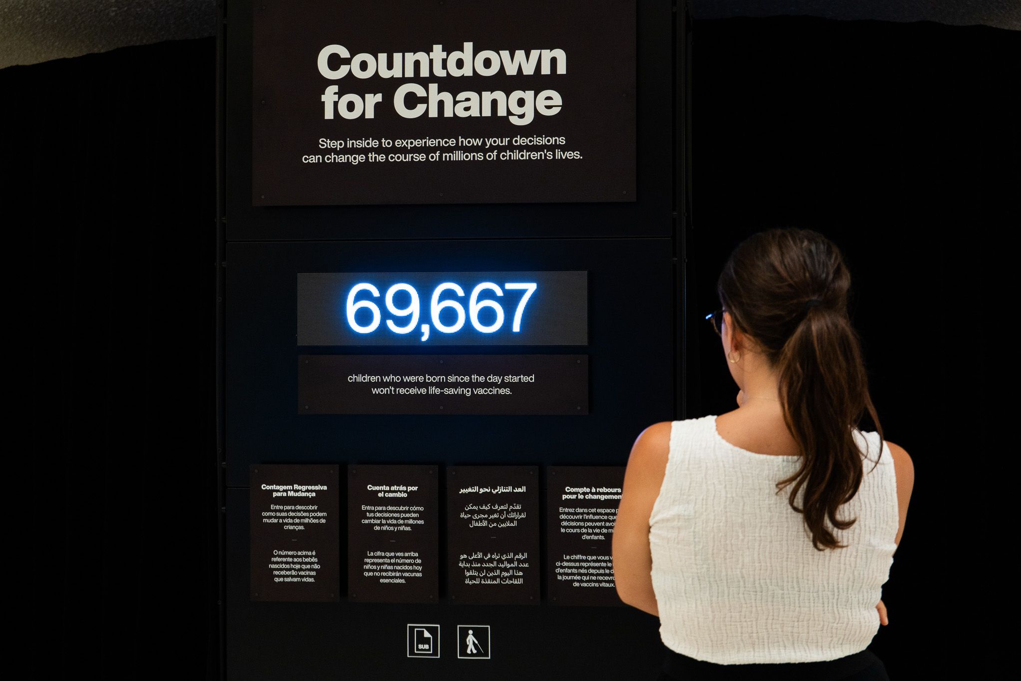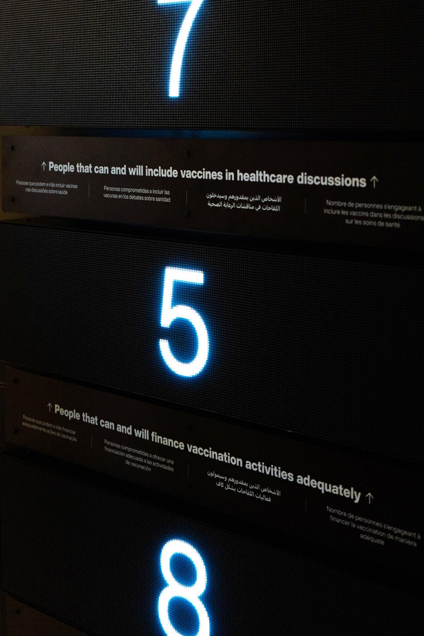 On arrival visitors were greeted by a panel displaying the number of unvaccinated children since the start of the day, setting the tone for the experience. They were then given headphones with language options and audio descriptions, ensuring accessibility.