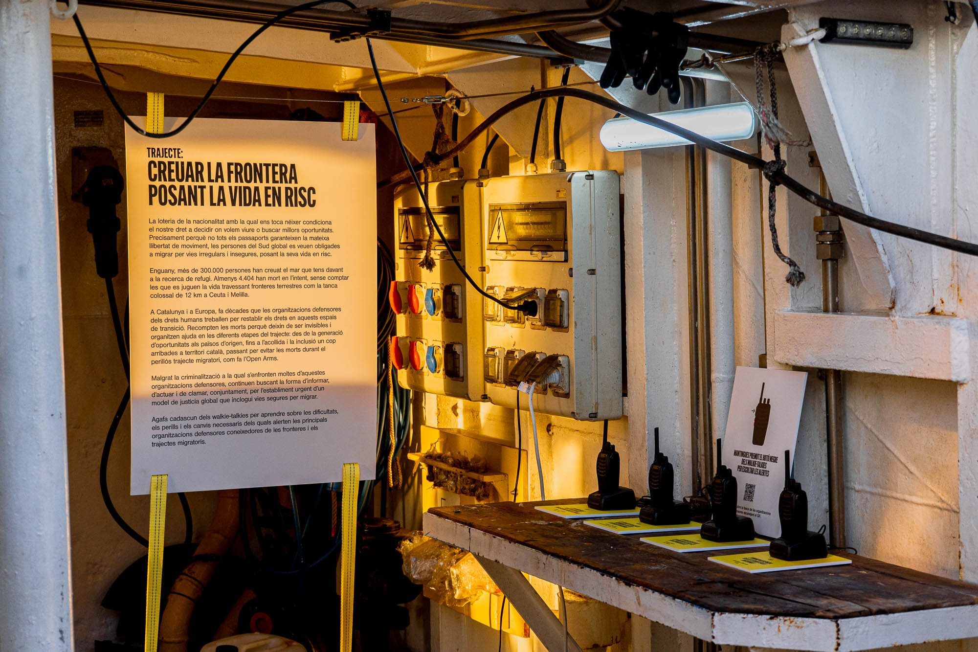 Walkie talkies are an essential tool for communicating onboard rescue boats, and here we use them to give a voice to those protecting the waters. Visitors could pick one up to hear stories of the difficulties, dangers, and changes that are desperately needed to protect the human rights of those making the crossing.