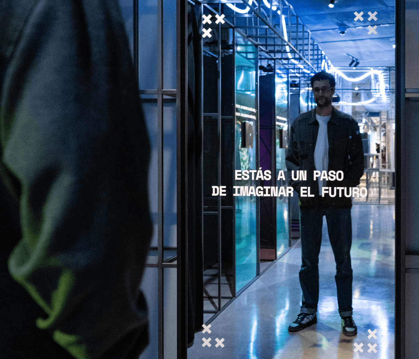 Before entering the room dedicated to the installation with the large screen, visitors pass through an antechamber—a transition space where they can hear, but not yet see, the sounds emanating from the main room. Because we wanted to invite them to reflect on themselves and the present state of things, we placed a mirror, with the words "You are a step away from imagining the future", as a prelude for the next part.