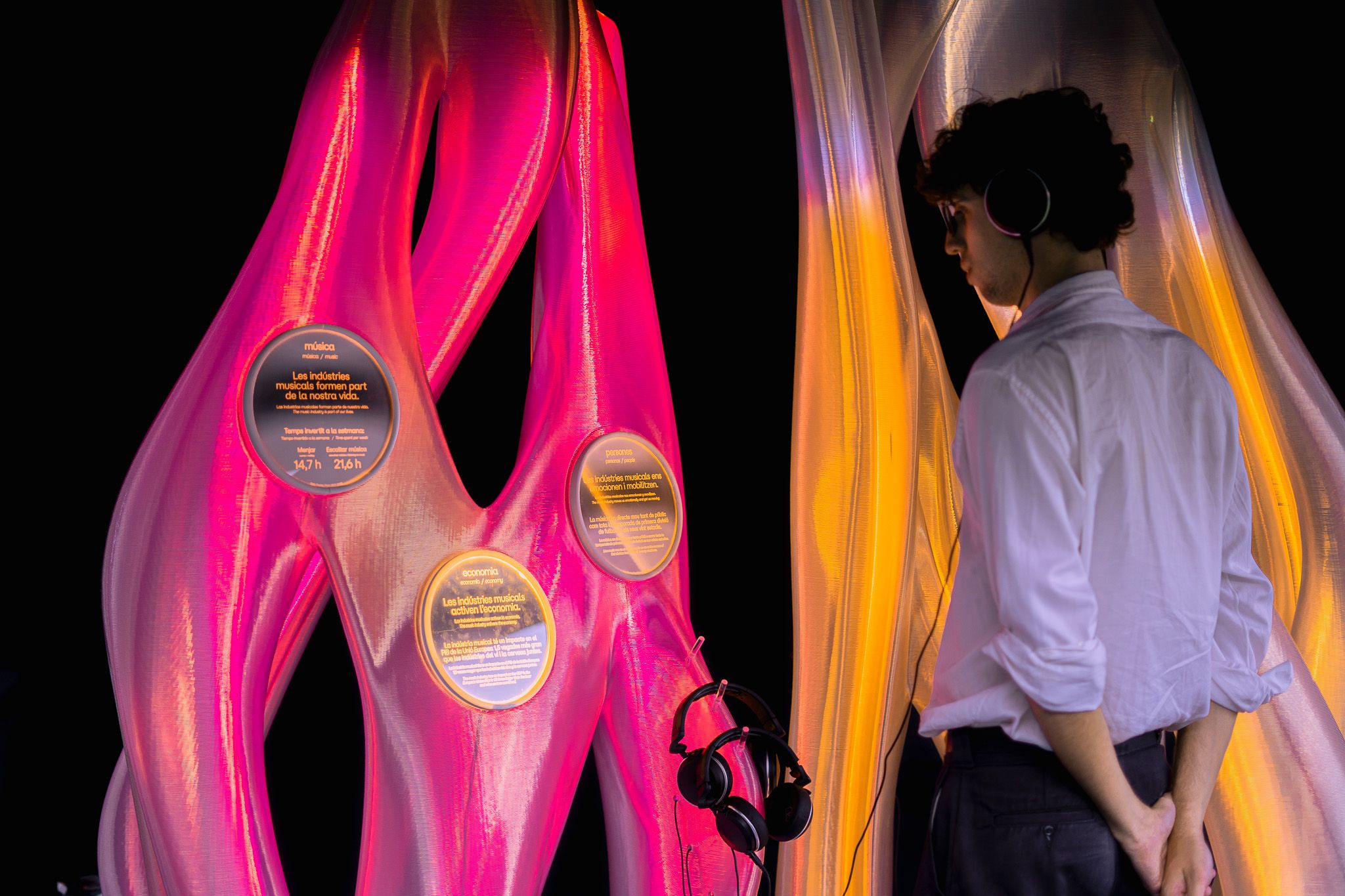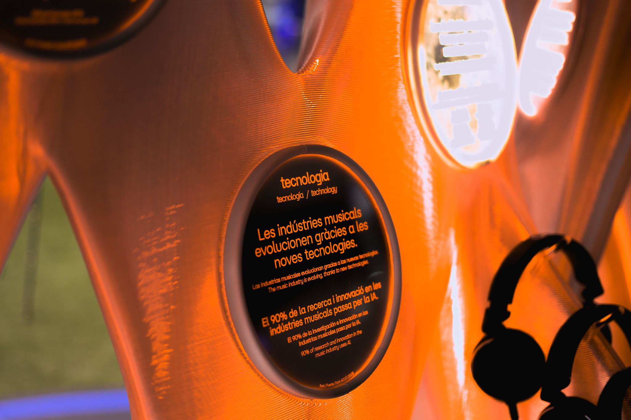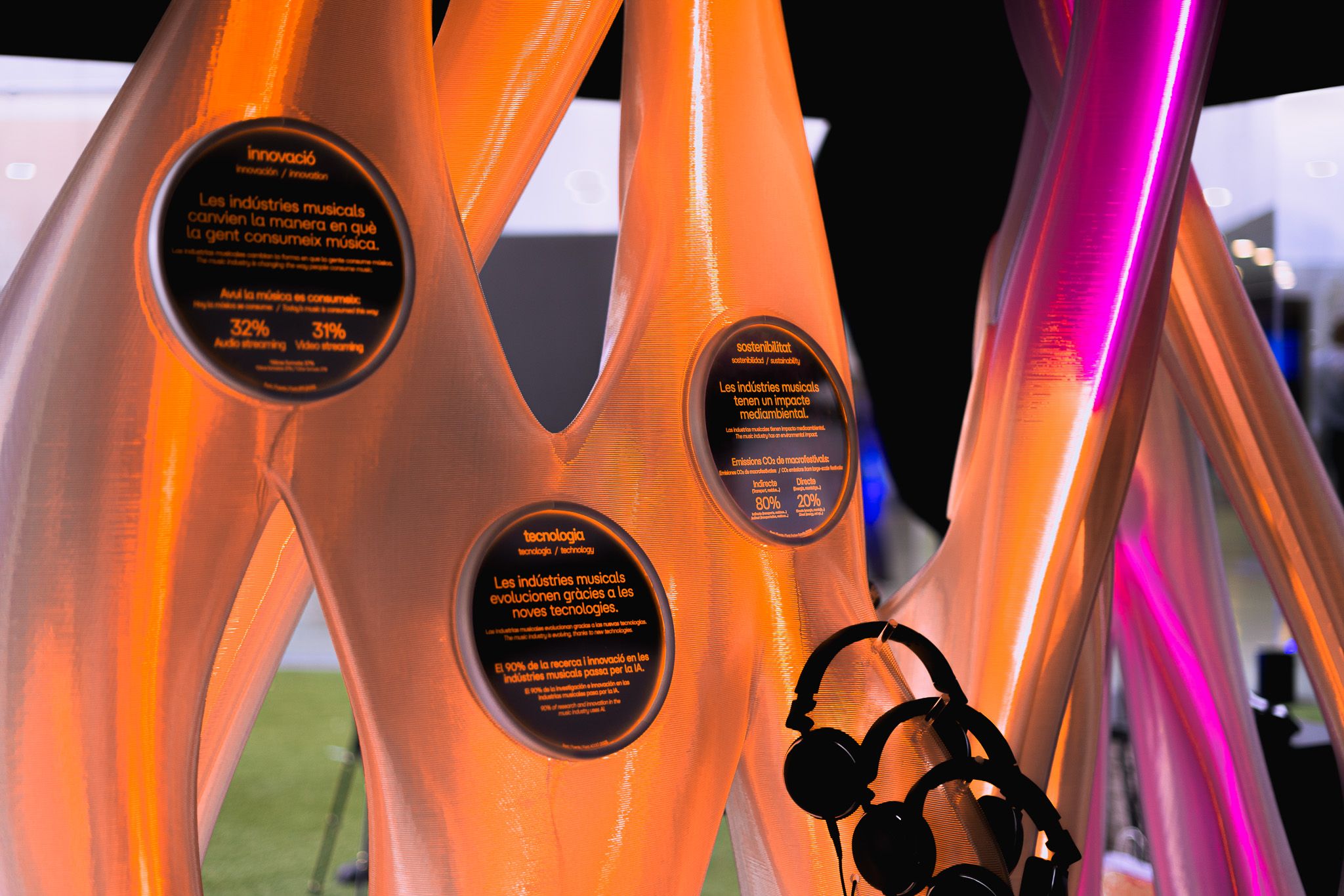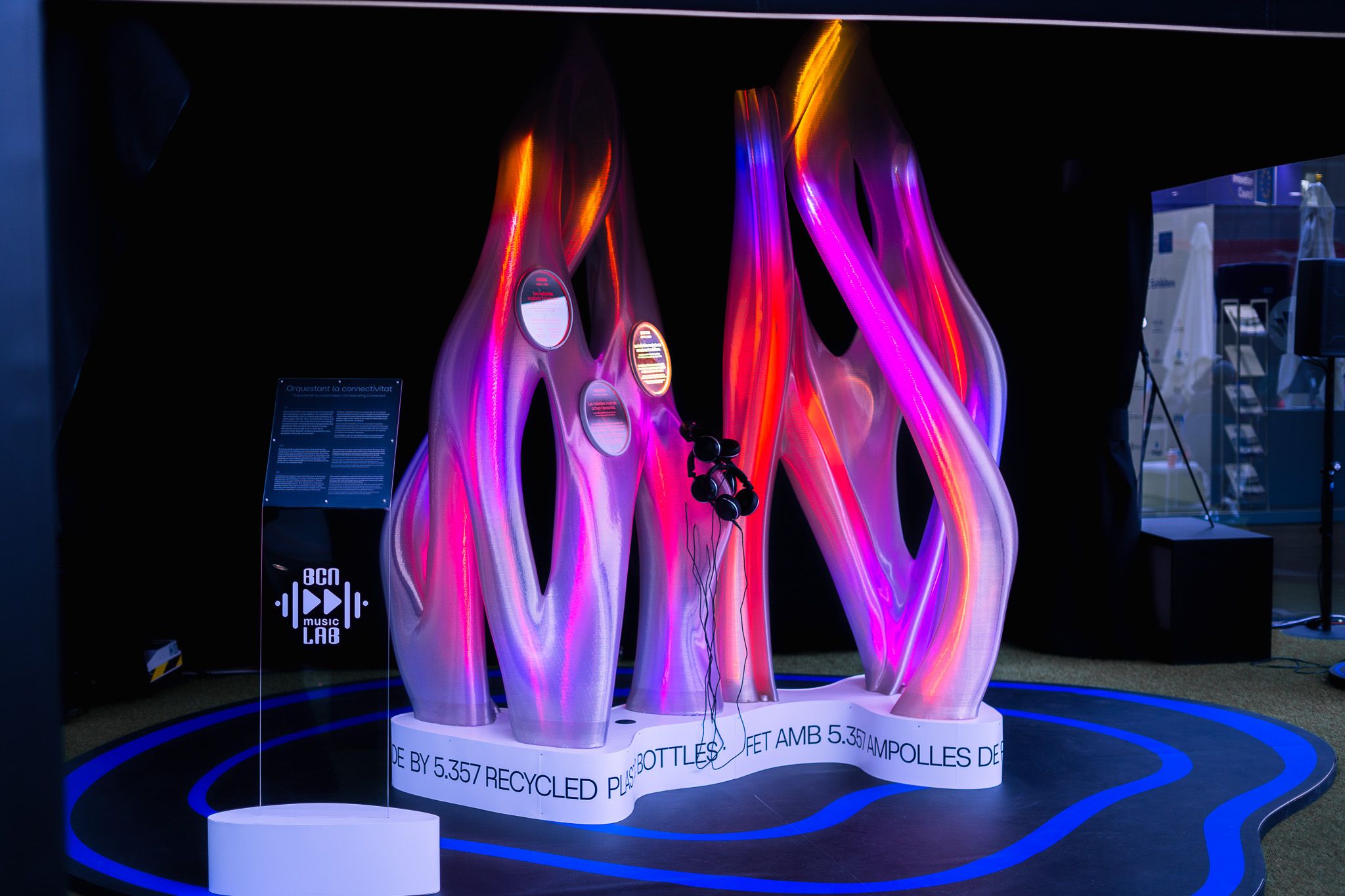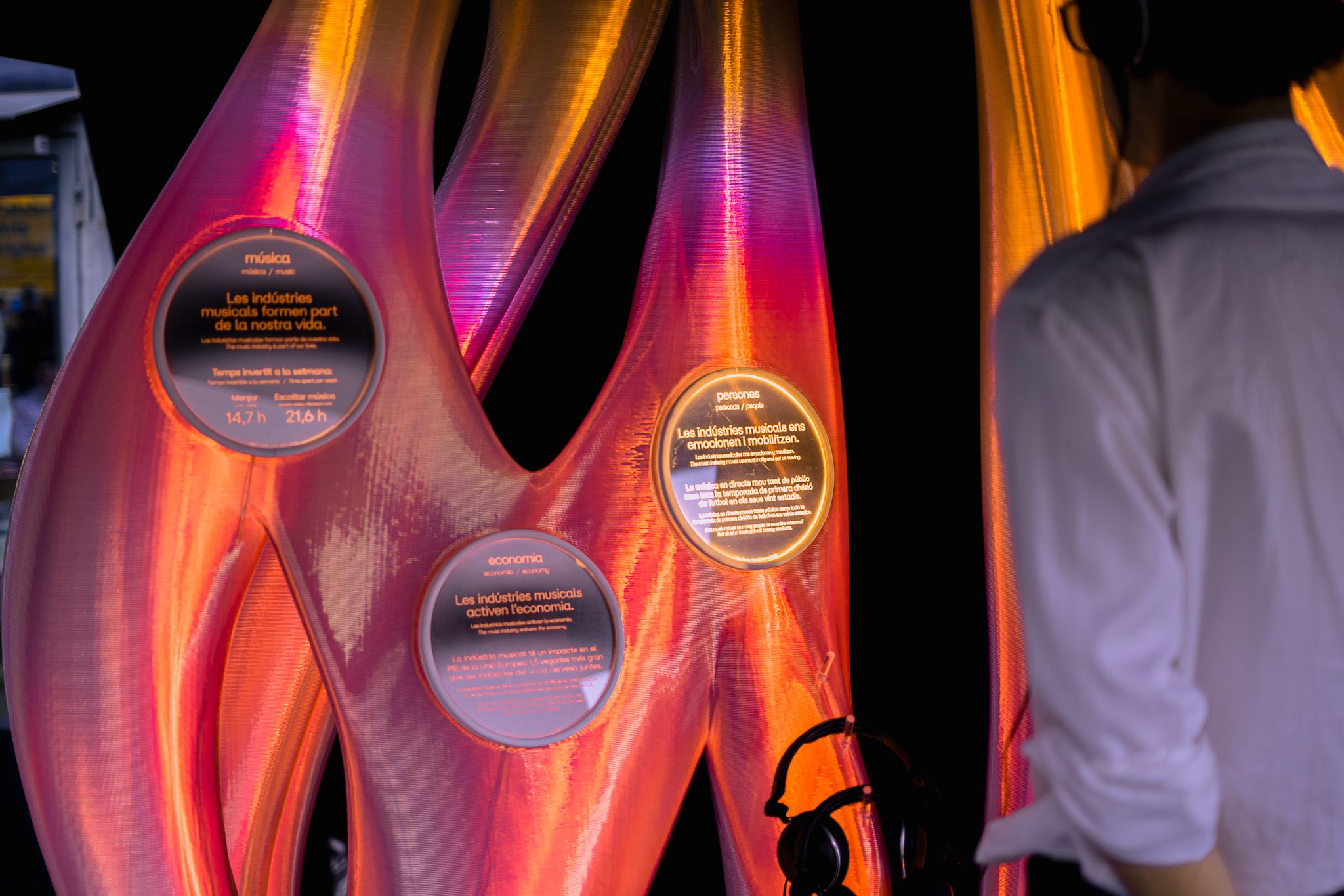 Visitors to the Mobile World Congress could approach the piece and learn about the relationship between innovation, technology and the environment in the music industry. The lights within the sculpture would illuminate to represent the data that was explained over the audio.