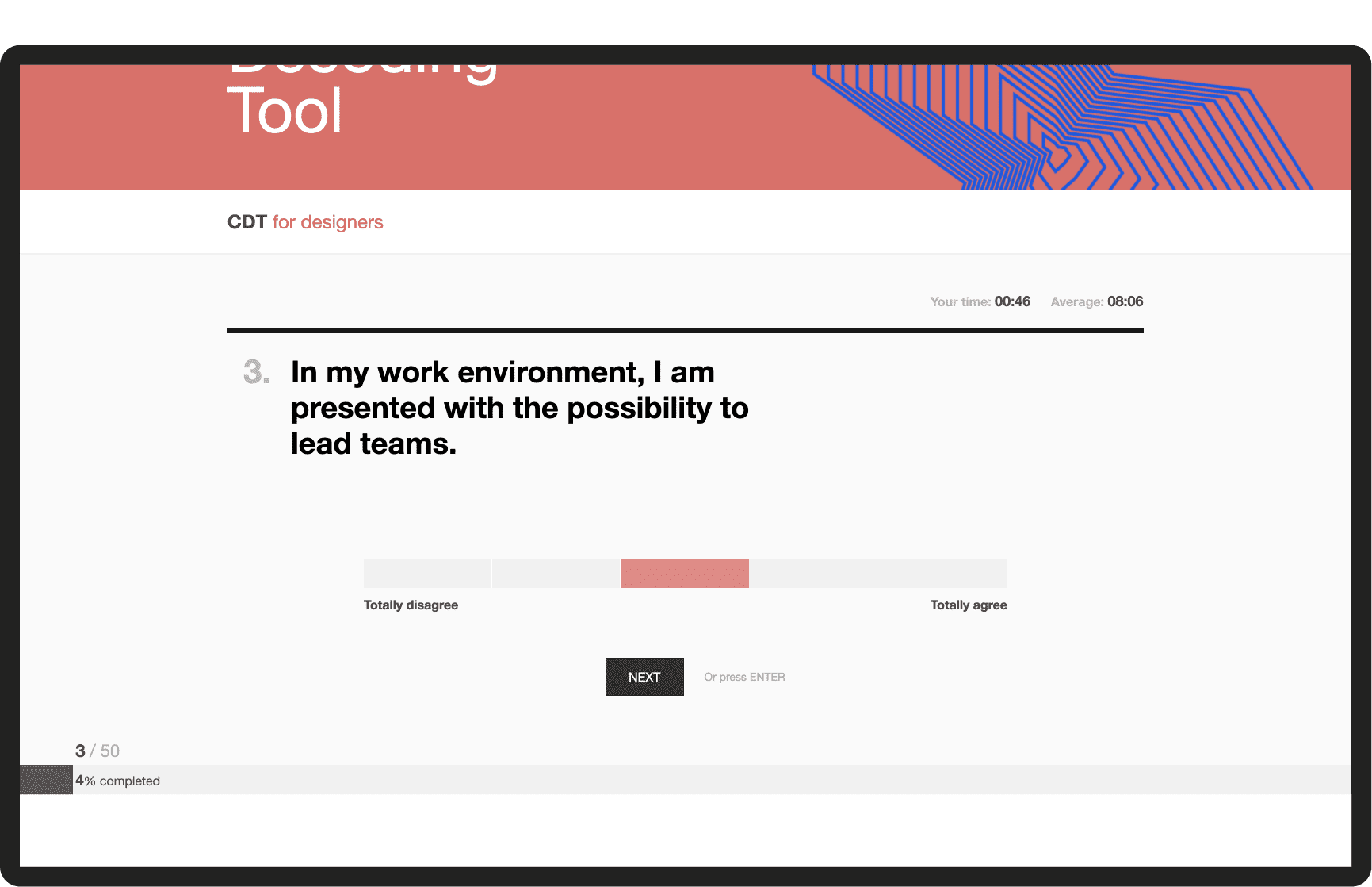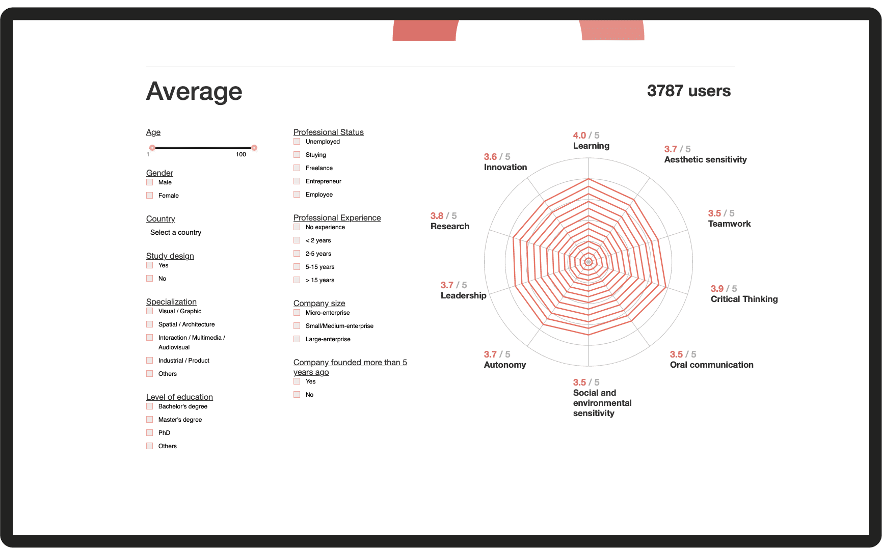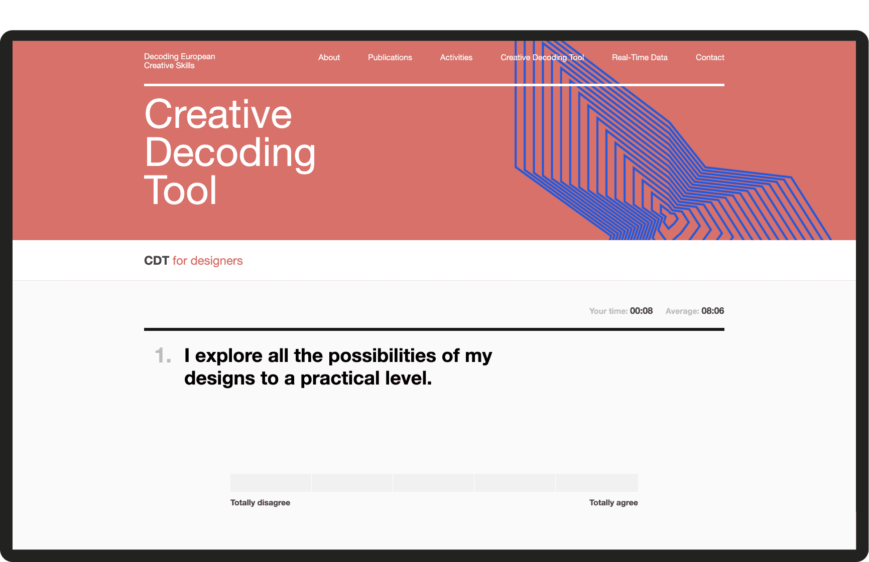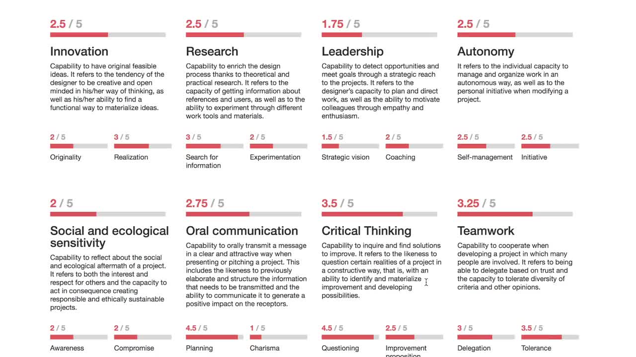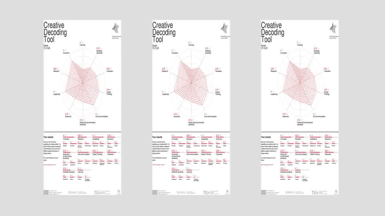 The main goal of the Creative Decoding Tool (CDT) was to provide a solid methodology of understanding the creative process of students and professionals related to the design practice. The project started as a collaboration between Elisava and DDS where the initial aim was to identify and study the main creative competences of designers. In a second phase, 10 core creative competencies were identified and with them, we created a survey-based behavioral test aiming to measure the presence and intensity of each competence in the design process of each respondent.