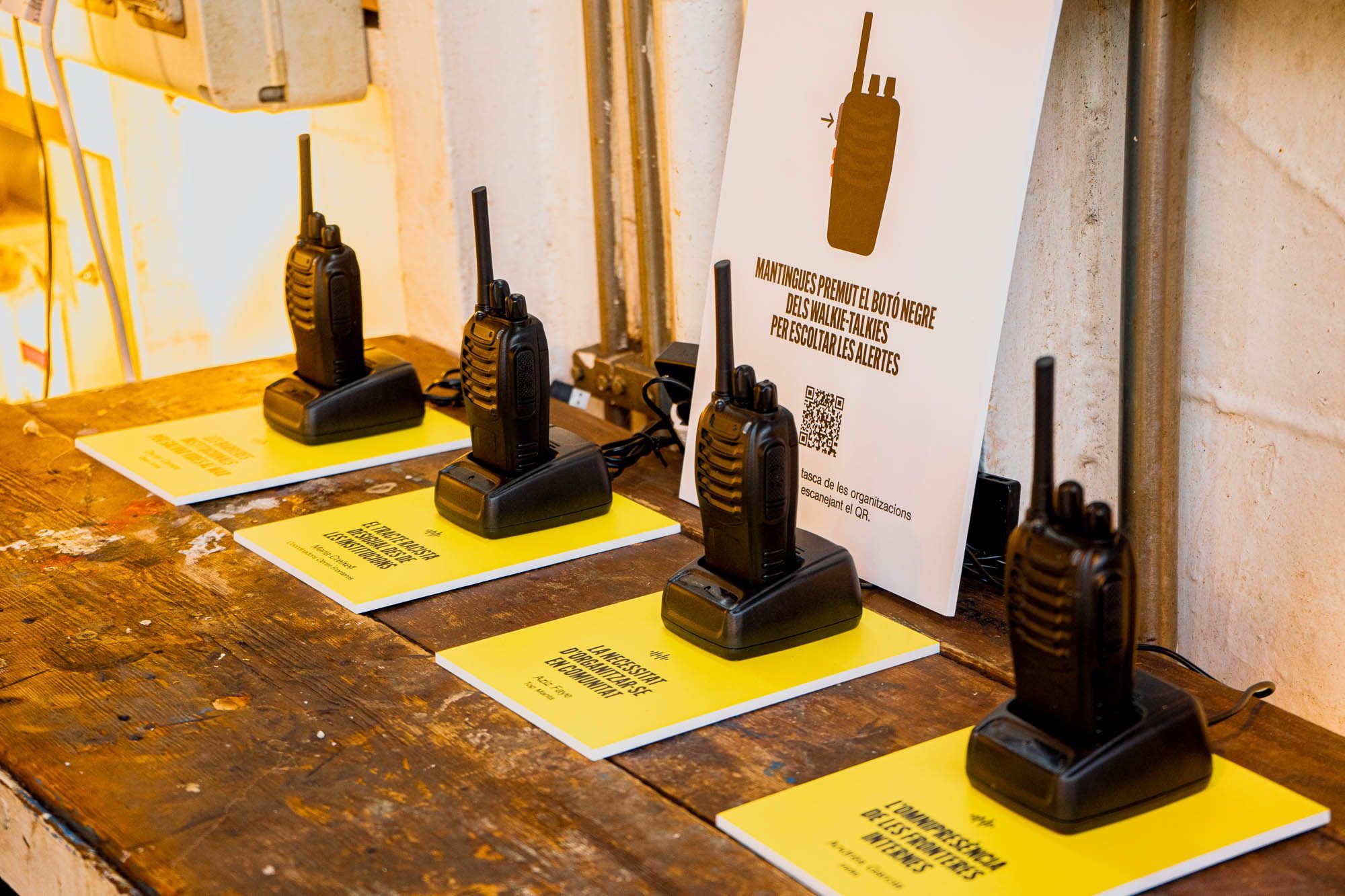 Walkie talkies are an essential tool for communicating onboard rescue boats, and here we use them to give a voice to those protecting the waters. Visitors could pick one up to hear stories of the difficulties, dangers, and changes that are desperately needed to protect the human rights of those making the crossing.