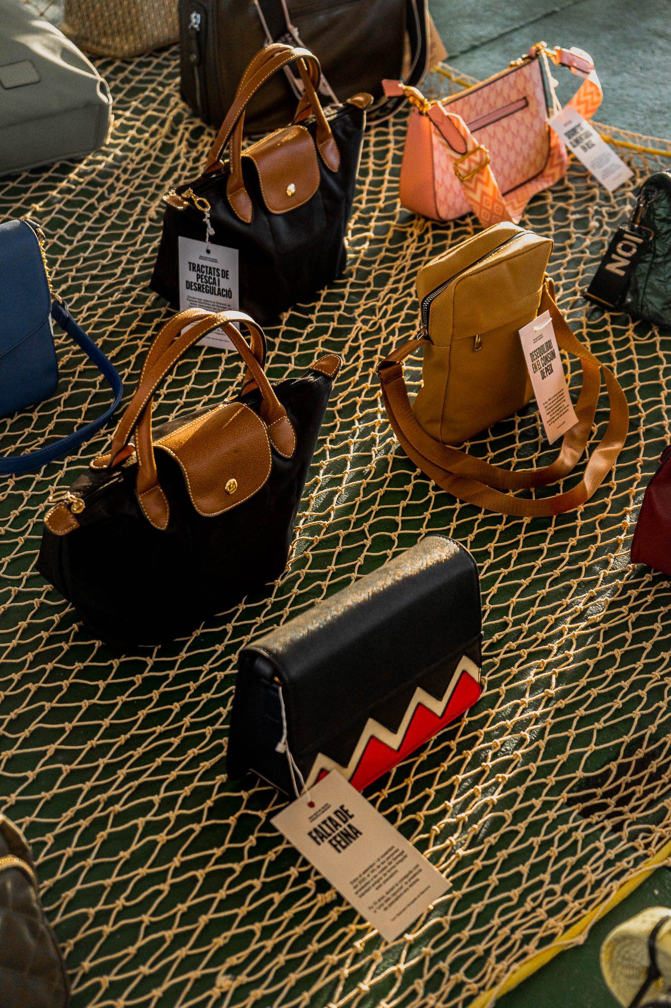 We put labels on these handbags to contextualise why many people from Senegal trade fishing nets for the blanket of street vending, due to European and international fishing treaties.