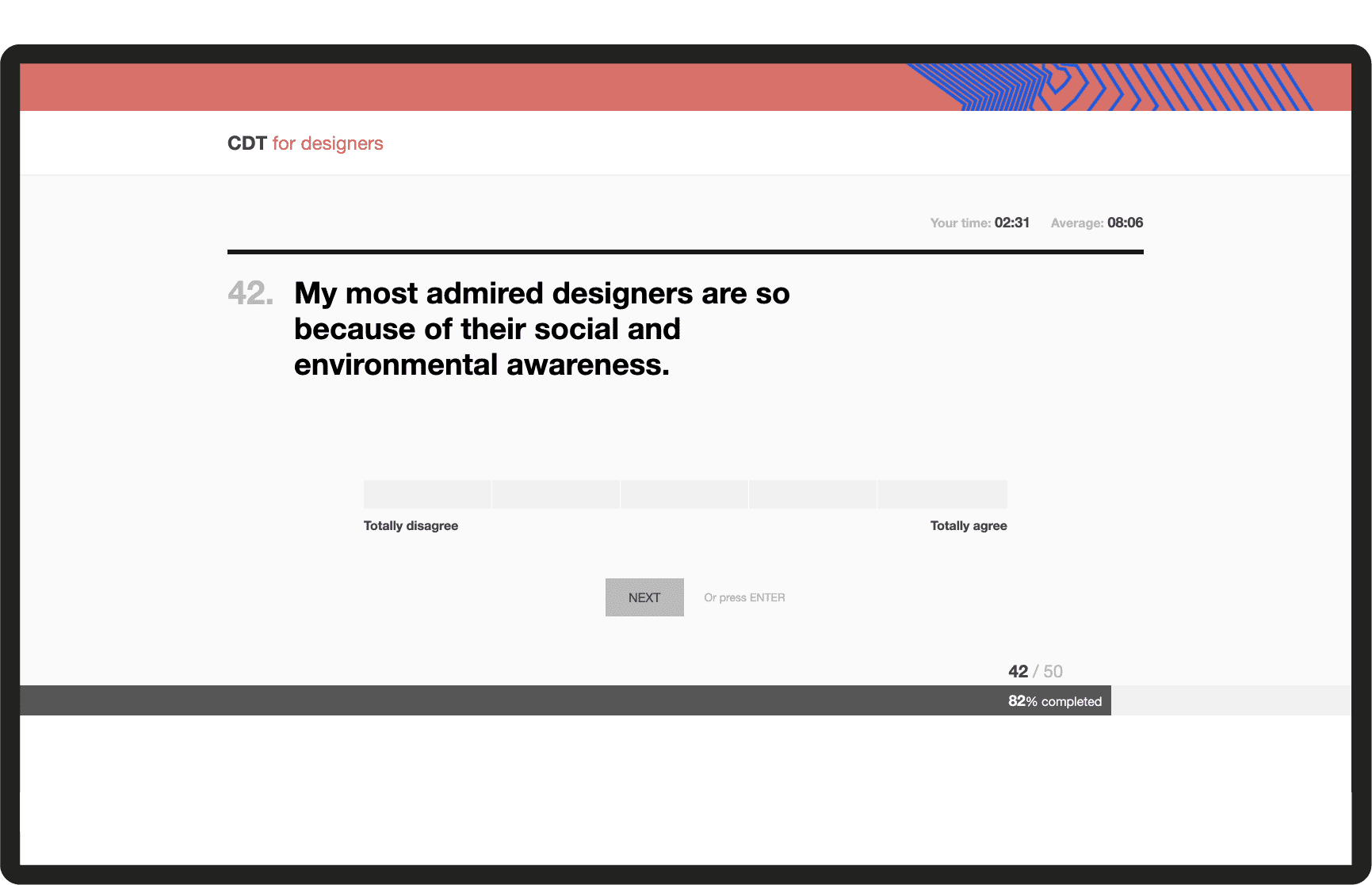 The main goal of the Creative Decoding Tool (CDT) was to provide a solid methodology of understanding the creative process of students and professionals related to the design practice. The project started as a collaboration between Elisava and DDS where the initial aim was to identify and study the main creative competences of designers. In a second phase, 10 core creative competencies were identified and with them, we created a survey-based behavioral test aiming to measure the presence and intensity of each competence in the design process of each respondent.