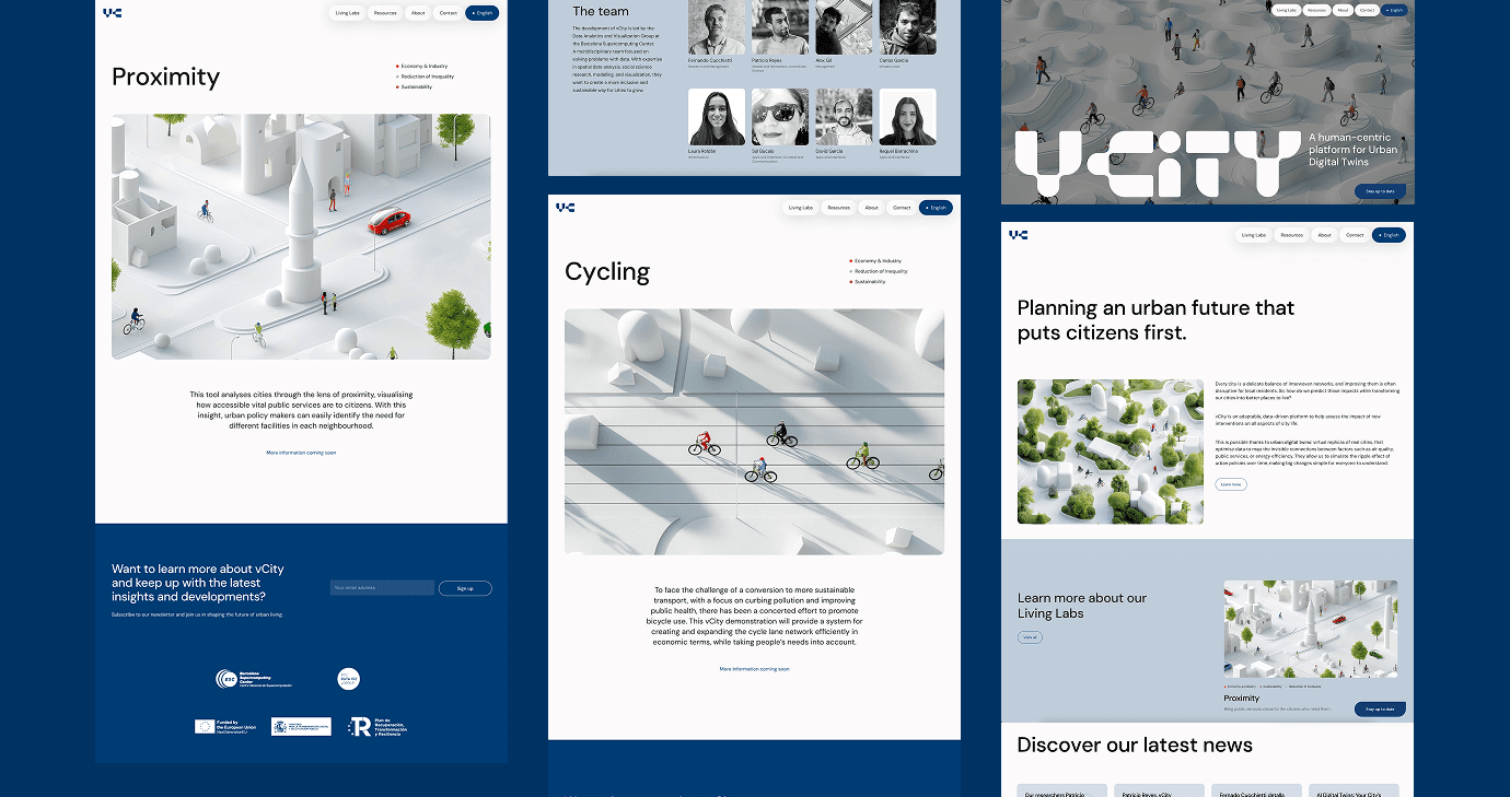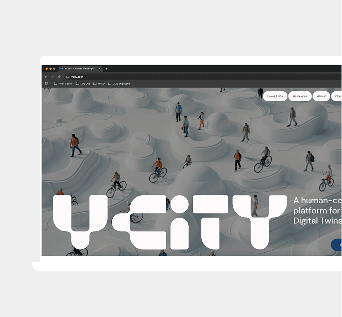 The resulting brand and digital presence translate a complex, emerging technology into a clear, human-centred system—designed to make urban data feel tangible, trustworthy, and rooted in everyday life.; it was made possible through close collaboration with Laura Elías (UI and graphic designer) and Veronika Gryshchuk (AI image designer), whose contributions helped bring the visual ecosystem to life. Visit the website → vcity.tech
