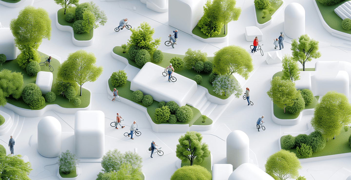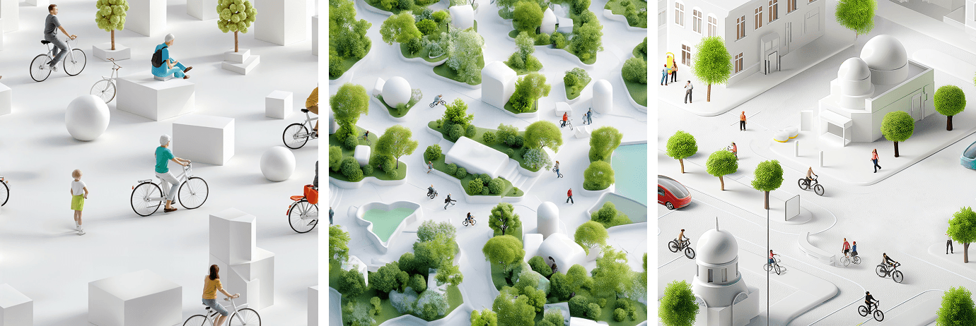 Beyond the traditional graphic branding system, we developed a complementary visual language using AI-generated imagery. These visuals were intentionally warm, accessible, and abstract—allowing us to communicate complex urban topics like mobility, 15-minute cities, or sustainability without depicting any specific location. This approach not only enriched the brand’s identity but also provided versatile tools for use across the wider vCity ecosystem.